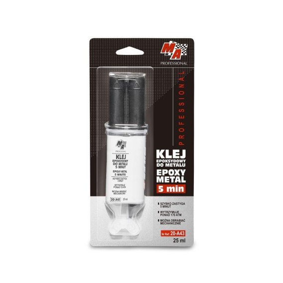 Klej epoxy metal MA Professional to szybko utwardzająca się masa epoxydowo-stalowa przeznaczona do naprawy uszkodzonych/pękniętych przedmiotów wykonanych z różnych stopów metali, drewna, wyrobów ceramicznych, wyrobów z tworzywa sztucznego i wielu innych materiałów. Produkt tworzy bardzo twarde spoiwo odporne na działanie temperatur do 150°C oraz jest odporny na działanie olejów samochodowych, przekładniowych i hydraulicznych, benzyny, wody oraz wielu innych substancji. Wstępne utwardzenie po upływie od 4 do 10 minut w zależności od temperatury otoczenia. Po jednej godzinie produkt jest utwardzony w 80%. Pełne utwardzenie następuje po 24 godzinach.