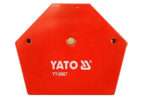 Kątownik magnetyczny wykonany z blachy stalowej oraz silnych magnesów ferrytowych. Umożliwia precyzyjne łączenie materiałów pod następującymi kątami: 30°, 45°, 60°, 75°, 90° i 135°. Udźwig magnesu ok. 34 kg. Powierzchnia lakierowana proszkowo. Przeznaczony do czasowego łączenia metalowych elementów podczas spawania, nawiercania, lakierowania, czynności wymagających używania obu rąk. Stosowanie kątownika magnetycznego pozwala na swobodne operowanie obiema rękami i wykonywanie czynności bez pomocy dodatkowej osoby. Pozwala na wstępne montowanie łączonych, metalowych elementów.