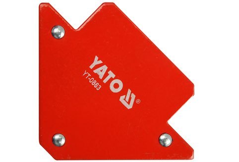 Kątownik magnetyczny wykonany z blachy stalowej oraz silnych magnesów ferrytowych. Umożliwia precyzyjne łączenie materiałów pod następującymi kątami: 45°, 90° i 135°. Udźwig magnesu ok. 11,5 kg. Powierzchnia lakierowana proszkowo. Przeznaczony do czasowego łączenia metalowych elementów podczas spawania, nawiercania, lakierowania, czynności wymagających używania obu rąk. Stosowanie kątownika magnetycznego pozwala na swobodne operowanie obiema rękami i wykonywanie czynności bez pomocy dodatkowej osoby. Pozwala na wstępne montowanie łączonych, metalowych elementów.