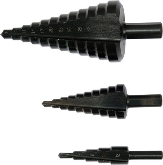 Zestaw trzech wierteł stopniowych do wiercenia w wysokogatunkowej stali nierdzewnej, stali konstrukcyjnej, stali walcowanej na zimno, metalach kolorowych, blachach stalowych i tworzywach sztucznych.